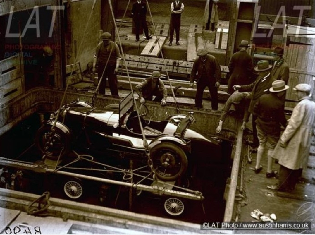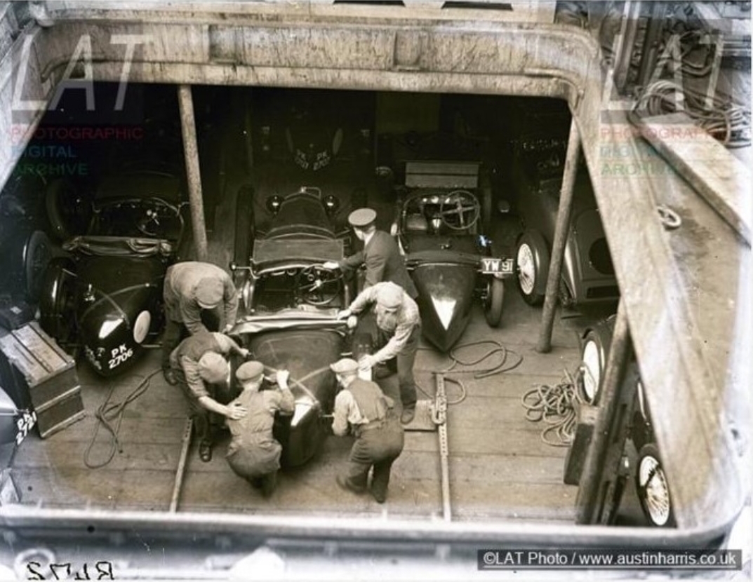 Period photographs which have recently come to light show the cars being loaded onto the boat headed for Ireland.