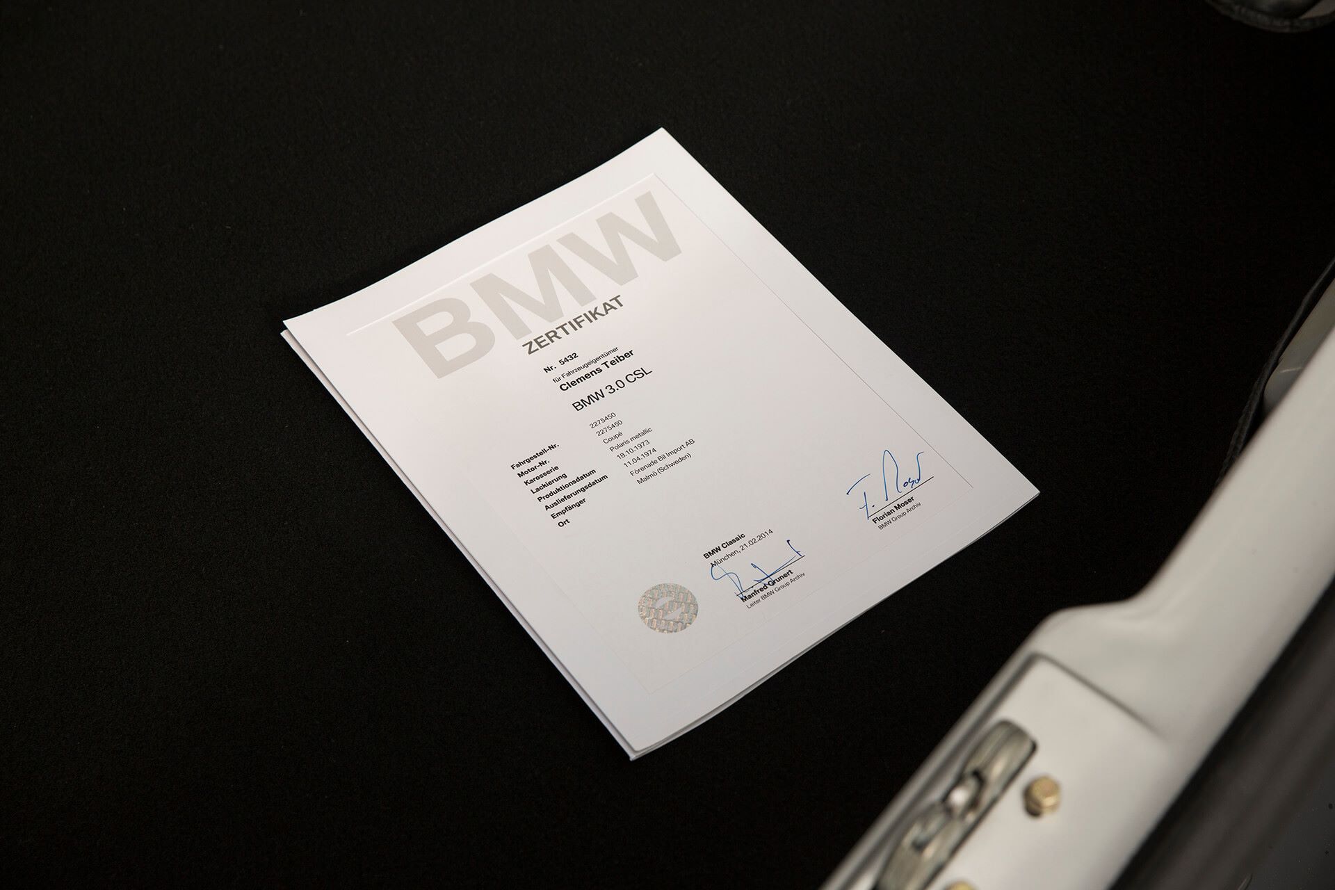 - a BMW-classic-certificate of the vehicle with the production date (18.10.1973), numerous additional information and a technical data sheet