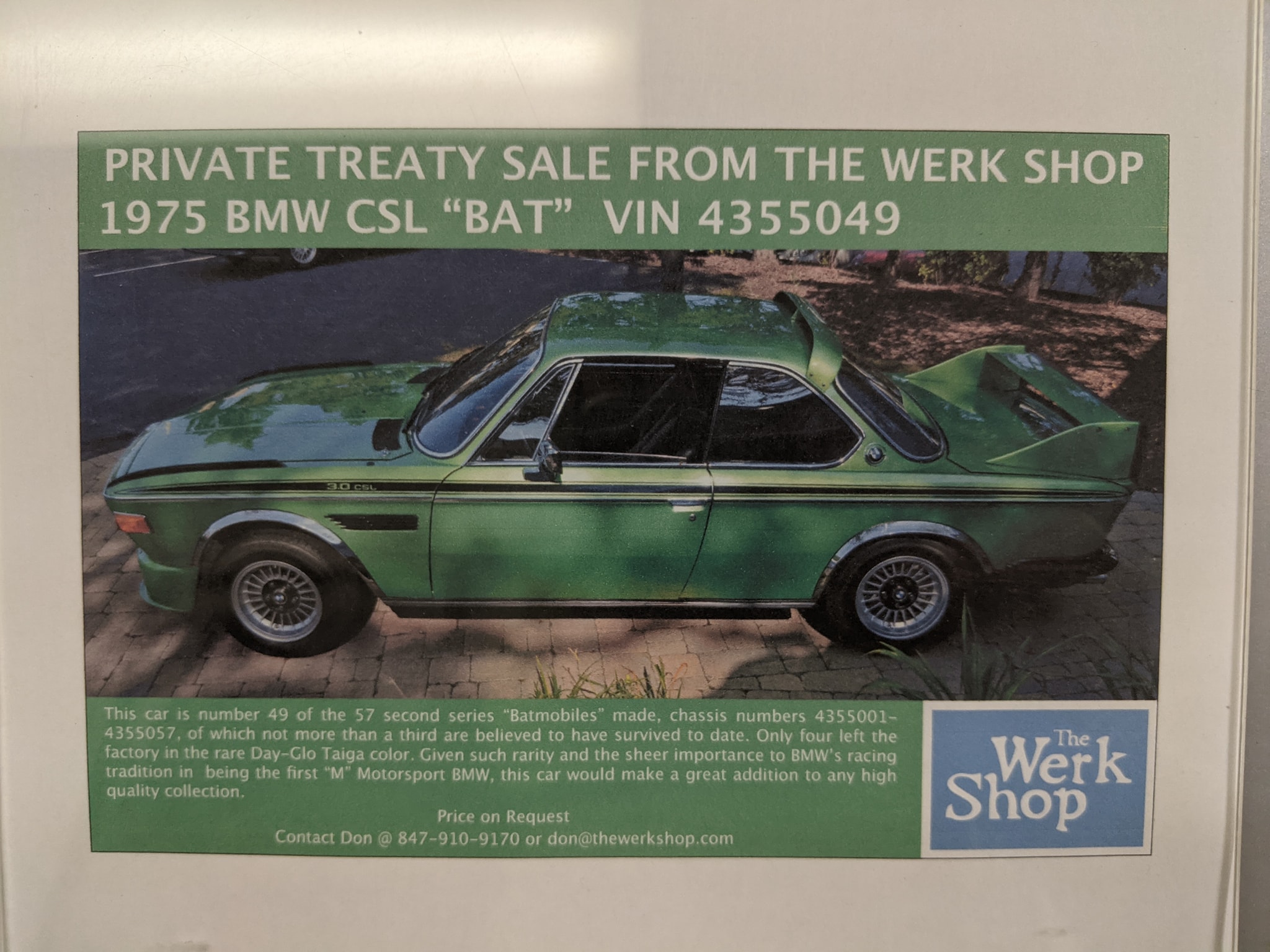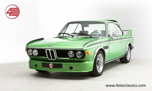 Condition: INTERIORThe wood in the car is in excellent condition and retains its original finish, it sits perfectly in the interior and looks like new. All the heater controls work as do all the dash lights and steering column controls. There is no radio which means you have no choice but to listen to the howl of the wonderful 3.2L straight 6, it also means no large unsightly speaker holes in the door cards or rear parcel shelf leaving it in fantastic condition. The original Petri sports steering wheel is still present and in fantastic condition. ENGINE & TRANSMISSIONWhilst still being badged a 3.0 CSL the engine stroke was increased which raised engine capacity to 3153cc. This Batmobile had the engine fully rebuilt when the car was restored, it runs perfectly and looks like new, a work of art in our eyes. The gearbox has also been overhauled to match the rest of the spectacular condition of the car. WHEELS, TYRES & BRAKESThe car is fitted with 16" Alpina wheels all of which are in perfect condition and shod with new Michelin tyres. During the restoration all the brakes have been overhauled and are not showing any significant signs of wear. Every component under the car has been refinished to meet factory specifications and then all bolts and nuts marked to ensure they have undergone their final tightening sequence. This attention to detail and quality control is proof of a thorough and professional restoration. http://www.4starclassics.com/BMW-CSL-Batmobile-For-Sale/ Equipment Lightweight front spoiler, Roof spoiler, Boot spoiler, Electric rear windows, PAS, Scheel sports seats, Sports steering wheel, Alloy wheels, Aluminum bonnet and door skins.