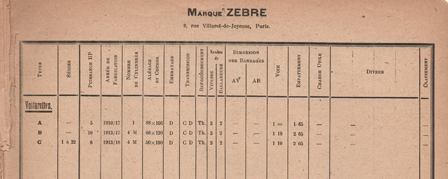 Le Zebre est la premiere voiturette en quantite produites et livrees a l'armee francaise. Apres une phase de requisition de voitures existantes, la production d'environ 40 voitures par mois permet de supporter l'effort de guerre. Le Zebre est a la premiere guerre mondiale ce que la Jeep sera durant le deuxieme guerre mondiale. L'armee choisira le Type C avec calandre plate, avec moins de laiton qui etait reserve aux etuis de balles. Numeros militaires: De 30 000 à 60 000 ce sont les immatriculations de 1915, dispersées. A partir du numéro 100 000 environ, les numéros sont chronologiques. Les photos ci-dessous sont presentees sous forme chronologique de production de voitures. ![]() ![]() ![]() ![]() ![]() ![]() BB Peugeot ont ete consideres comme un complement capacitaire a la fourniture Le Zebre.